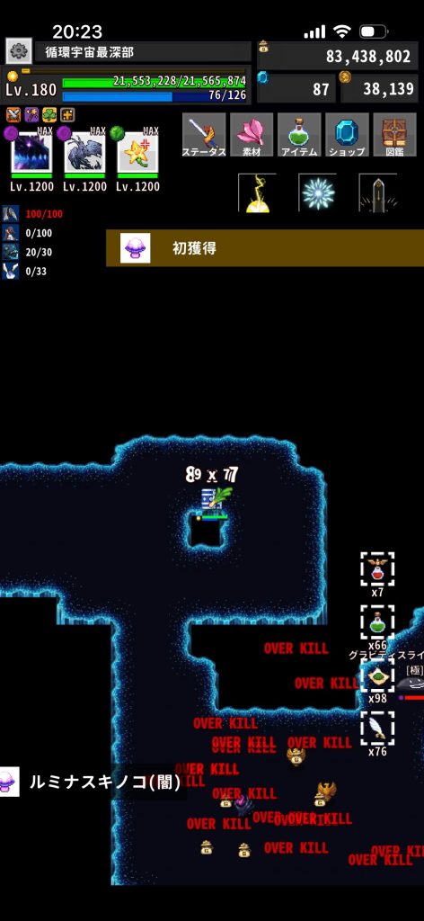 カンストには膨大な時間がかかってしまいますが、当面の目標はマルコゲトカゲ放置のためにルミナスキノコ40個集めるというところなので、これなら集めきれそうだと感じました!!