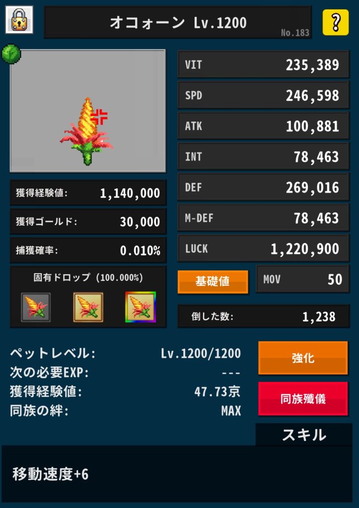 そんなオコーンを絆MAXにすると、移動速度アップが4から6に増えます!周回速度・普段の移動速度が上がるので、ちょっと便利になります!